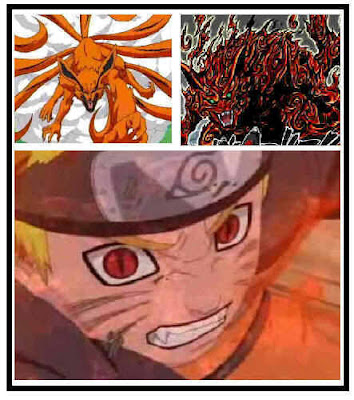 Nos momentos em que NARUTO é possuído por este demônio ocorre uma verdadeira transformação, a sena pode ser descrita como POSSESSÃO DEMONÍACA, idêntica em seus sintomas as que costumamos ver regularmente em algumas igrejas evangélicas. Porem alem de ser possuído, NARUTO também toma a forma da besta, seu corpo se deforma, suas garras crescem e seus olhos assumem a forma de olhos de animal.