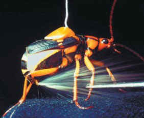 Esse besouro utiliza esse recurso para defesa e ao observarmos temos a impressão que o animal está expelindo fogo de seu corpo. O produto inflamável está a uma temperatura de 212°F (100°C) e é protegido pelo uso de um inibidor natural, não prejudicando o seu portador