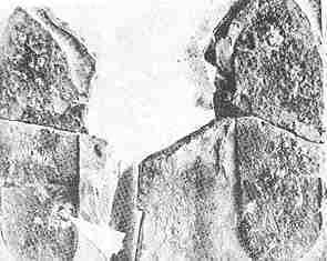 A foto a cima é a reprodução de um fóssil de pegadas humanas numa rocha cambriana. Um trilobite amassado indicado pela seta, pode ser observado numa das pegadas.